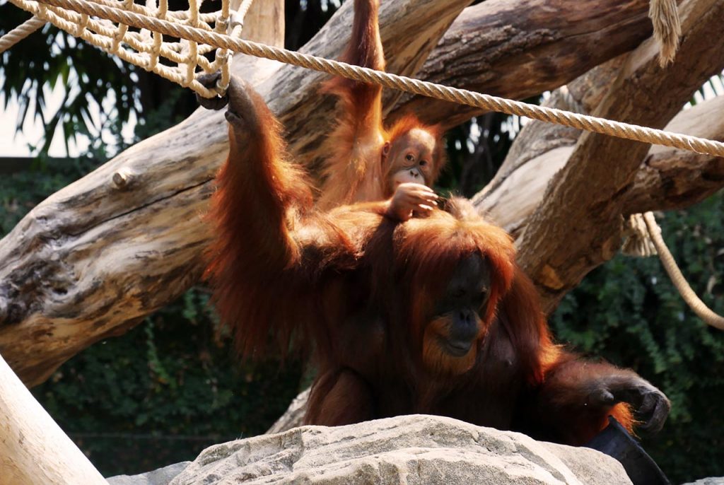 Das Orang Utan-Haus ist liebevoll angelegt und die halbkugelförmige durchsichtige Kuppel kann bis zur Hälfte geöffnet werden. Im 16 Meter hohen Haus gibt es u.a. Bäume, Bambustangen sowie ein Wasserfall. Kletternde und spielende Sumatra Orang-Utans erkunden munter das Gelände des Hauses und können von verschiedenen Stellen sehr gut beobachtet werden.