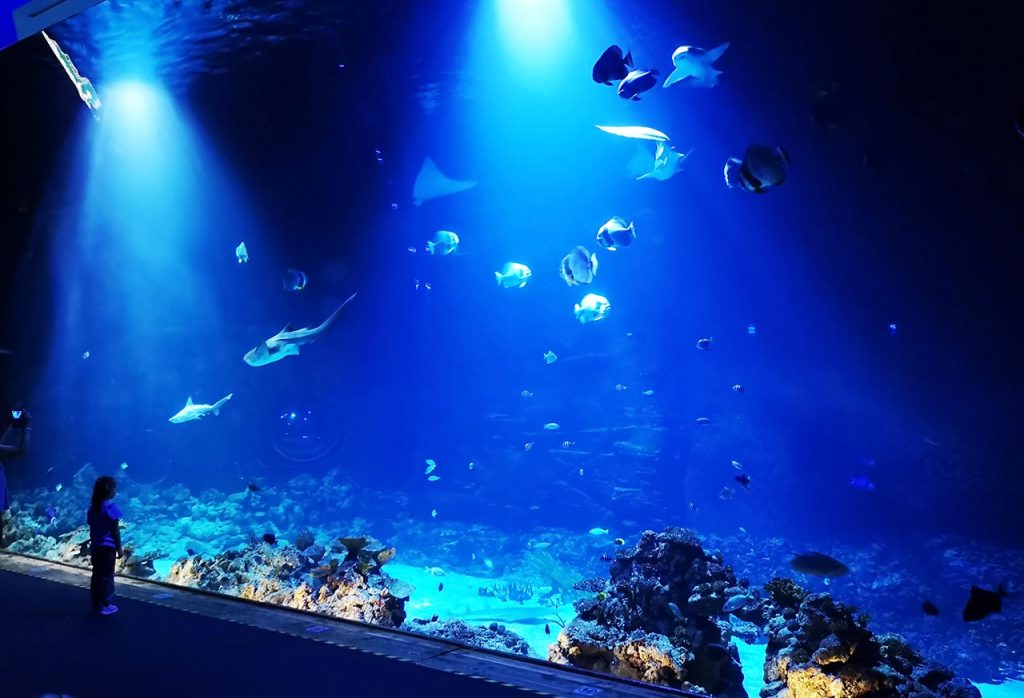Der Aquariumsbereich (die Unterwasserwelt) beinhaltet über 19 Seewasser- und 10 Süßwasserbecken. Ca. 13.000 Fische sind hier zu bestaunen. Faszinierender Höhepunkt: das Große Hai-Atoll. Durch riesige Panoramascheibe konnten wir u.a. Haie und Rochen in einer der größten Meerwasser-Anlagen Europas durchqueren sehen. Das Hai-Atoll hat eine 14 Meter lange, sechs Meter hohe und 22 Zentimeter dicke, konkav gebogene Acrylglas-Scheibe.