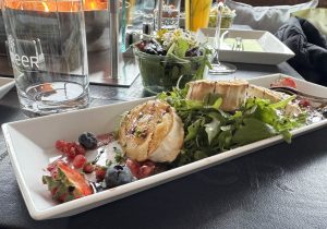 In gemütlicher Atmosphäre der winterfesten Terrasse haben wir an einem kleinen Feuertisch (mit Glasplatte abgeschirmte Kochstelle) Essen gegrillt und Brote geröstet. Je ein eigener Spies wird mit Fisch, Fleisch oder Gemüse über einer Feuerstelle gedreht. Unsere Wahl war u.a. ein Spies mit Ananas, Garnelen und Lachs. Zu den BBQ-Spießen gibt es köstliche Vorspeisen und Beilagen wie z.B. Süßkartoffel aus dem Ofen mit Guacamole. Die hausgemachten Saucen zum Burger sind schon eine Reise wert.